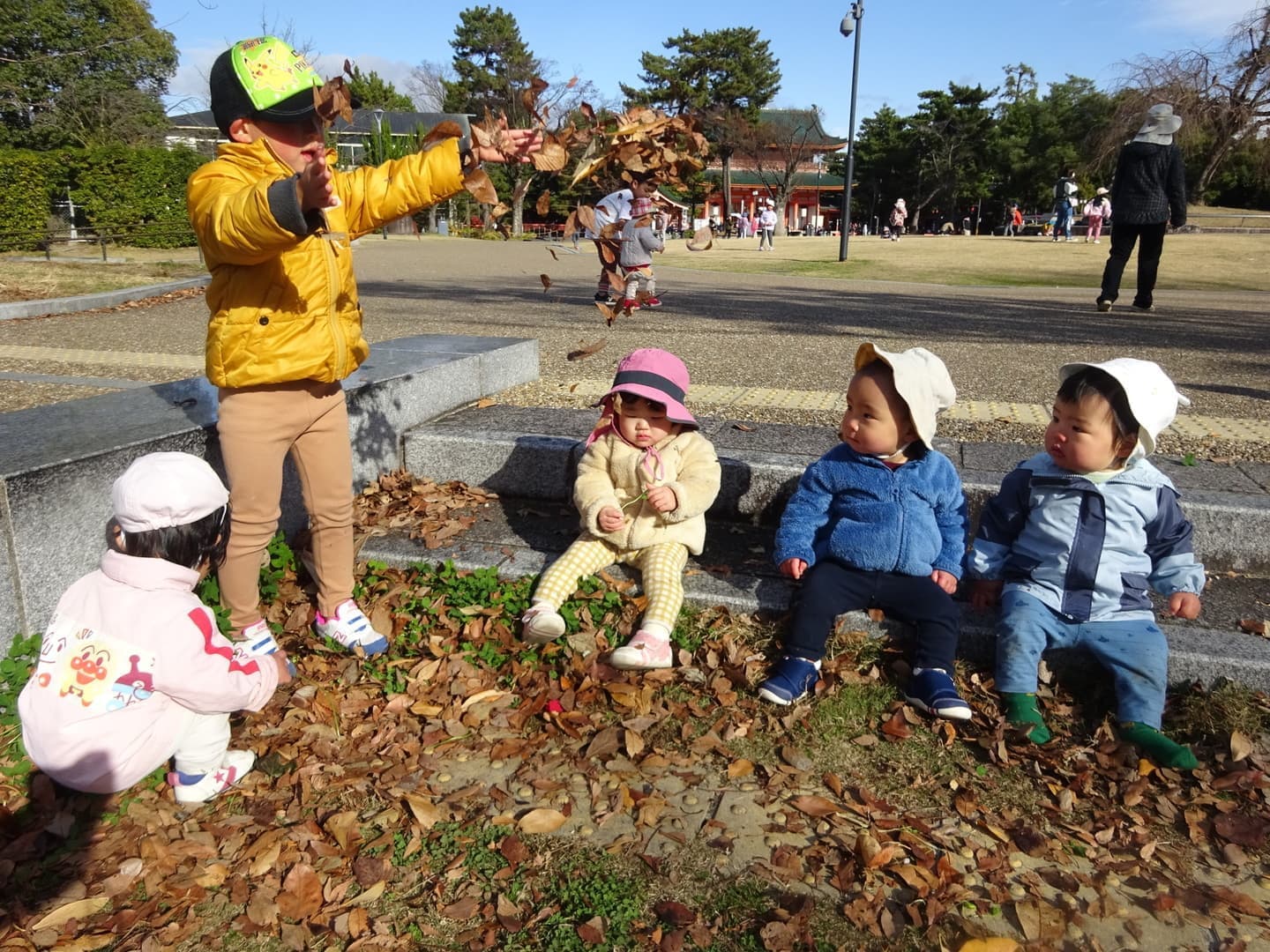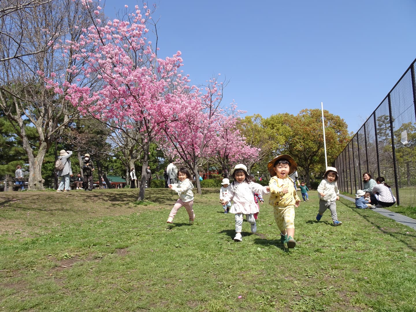 岡崎公園をはじめ、山あり川あり公共施設ありと、散歩の環境に恵まれています。全年齢が週の半分以上散歩に出かけ、身体も心ものびのびと遊ぶ中で、足腰が強くなり、体力もつき、自然に親しむこともできます。 定員60名の小さな保育園ならではの、家庭的な雰囲気を大切に保育し、毎日の生活の中で、小さい子が大きい子の真似をしたり憧れを持ったり、また大きい子が小さい子へ優しく関わることが自然に身についています。